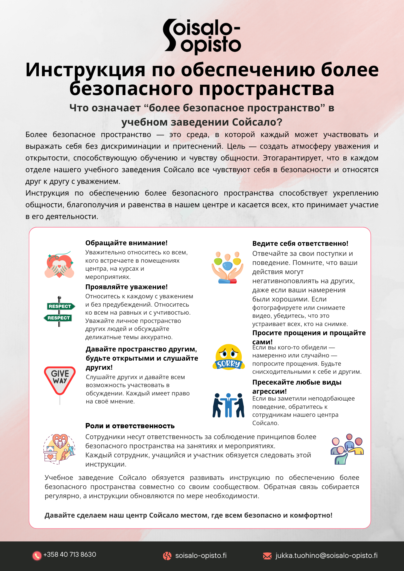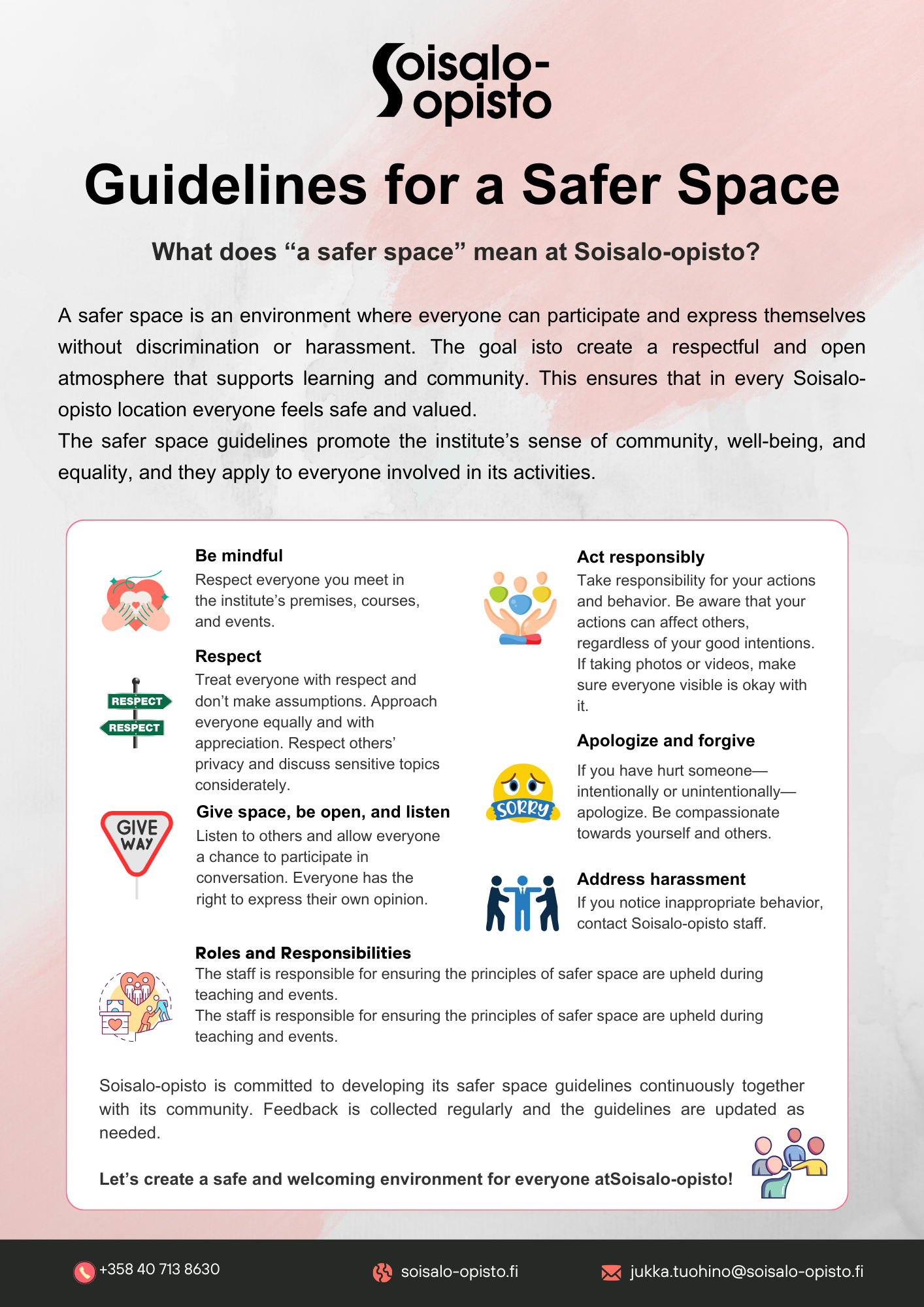 Turvallisempi tila on ympäristö, jossa jokainen voi osallistua ja ilmaista itseään ilman syrjintää tai häirintää. Tavoitteena on luoda kunnioittava ja avoin ilmapiiri, joka tukee oppimista ja yhteisöllisyyttä. Tällä varmistetaan Soisalo-opiston jokaisessa toimipisteessä, että kaikki tuntevat olonsa turvalliseksi ja arvostetuksi.